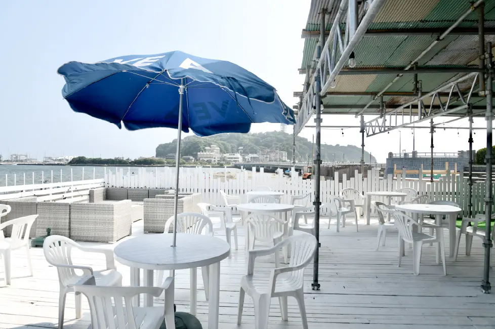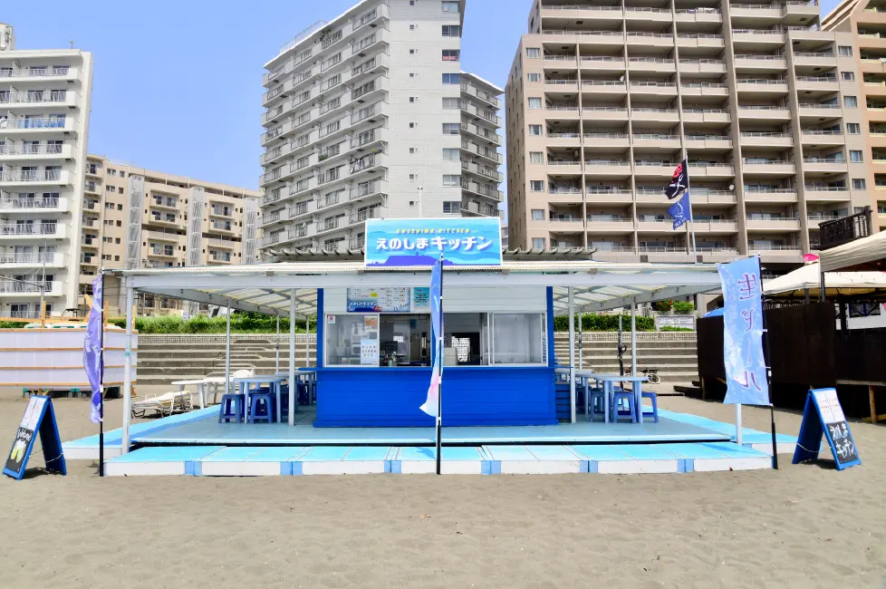 江ノ島では珍しいフードコートスタイルの海の家!BLUEの海の家が目印。