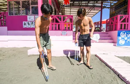 営業が終わった後の片付けでは、磁石付きの専用器具で砂浜をしっかりさらい、クギなどの危険物を取り除いています。解体後も、安心・安全にご利用いただけるよう万全の対策をしていますので、ご安心ください。