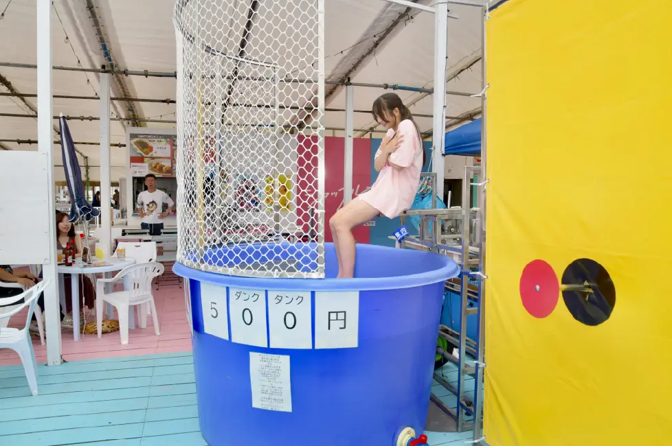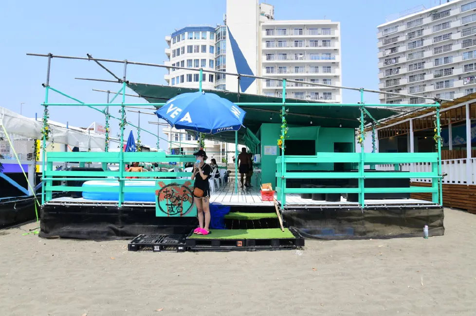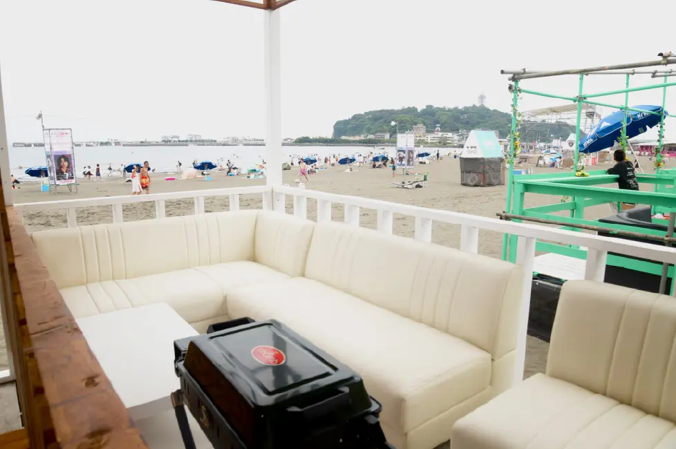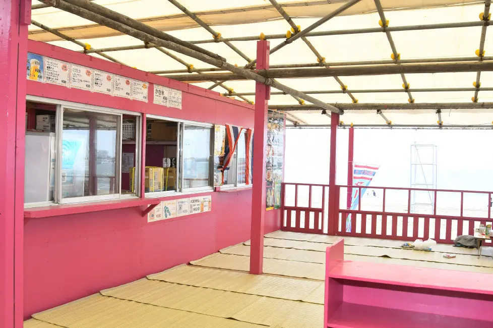 爽やかなウッドデッキのテラス席とは対照的に、昔ながらのお座敷席スペースは東浜随一の広さを誇る。その落ち着いた空間は、日常の忙しさを忘れるほど魅力的だ。老若男女、楽しんでもらえるように、若い人はテラス席で、家族連れはお座敷へ、海にデビューはまだ早いちびっ子にはプールも用意されている。今期も白いドーム型のエアコン付きの個室を設置。1日1万円で提供。普段海に来るチャンスの少ない三世代の家族の方々に好評を博している。花王のエッセンシャルとニベヤからシャンプー、コンディショナー、ボディーシャンプーが提供されているので日焼け女子にも好評。