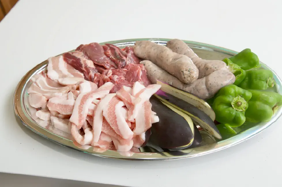 人気のバーベキューコースは、牛肉、鶏肉、豚肉に野菜盛り!が盛られ(写真のソーセージはフランクフルトに変更)お一人様6,500円で、生ビール付きの2時間飲み放題プランがおすすめ。綺麗な店内で美味しいBBQを楽しむ。友人達とのささやかな幸福を感じるはず。