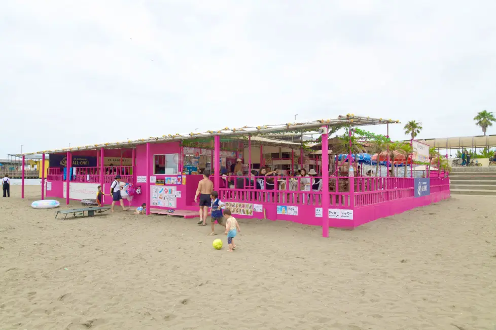 カラフルなピンク色が目印。東浜で350名が入店できる大きな海の家。