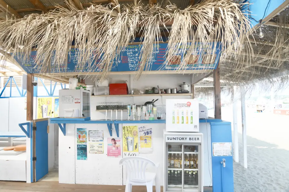 周りのおしゃれな海の家とは一線を画し、家族連れやお年寄りでも安心して入店しやすい店構え。白と青をシンプルな基調とした涼しげな海の家は、昔から変わらぬ同じスタイルで営業をしている。メニューには子供が好きな定番が多く、丼物(1200円)チャーハン(900円)カレー(900円)おでんなど近所の学生も台所代わりに食べにくるほど。