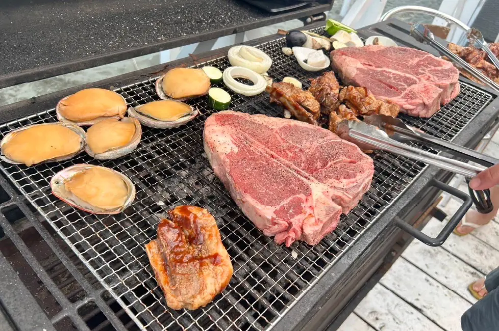 名物のBBQは「プレミアムBBQ」4500円、気になるの内容は、グラスフェッドビーフ、ポークスペアリブ、バーボンチキン 各種100gに野菜各種。牡蠣、帆立などの海鮮が並ぶ。このメニューに「海鮮セット」2200円、「牡蠣セット」2000円で追加が可能。他にも多彩なオプションが用意されている。さらに2000円プラスで飲み放題をつけることもできる。
